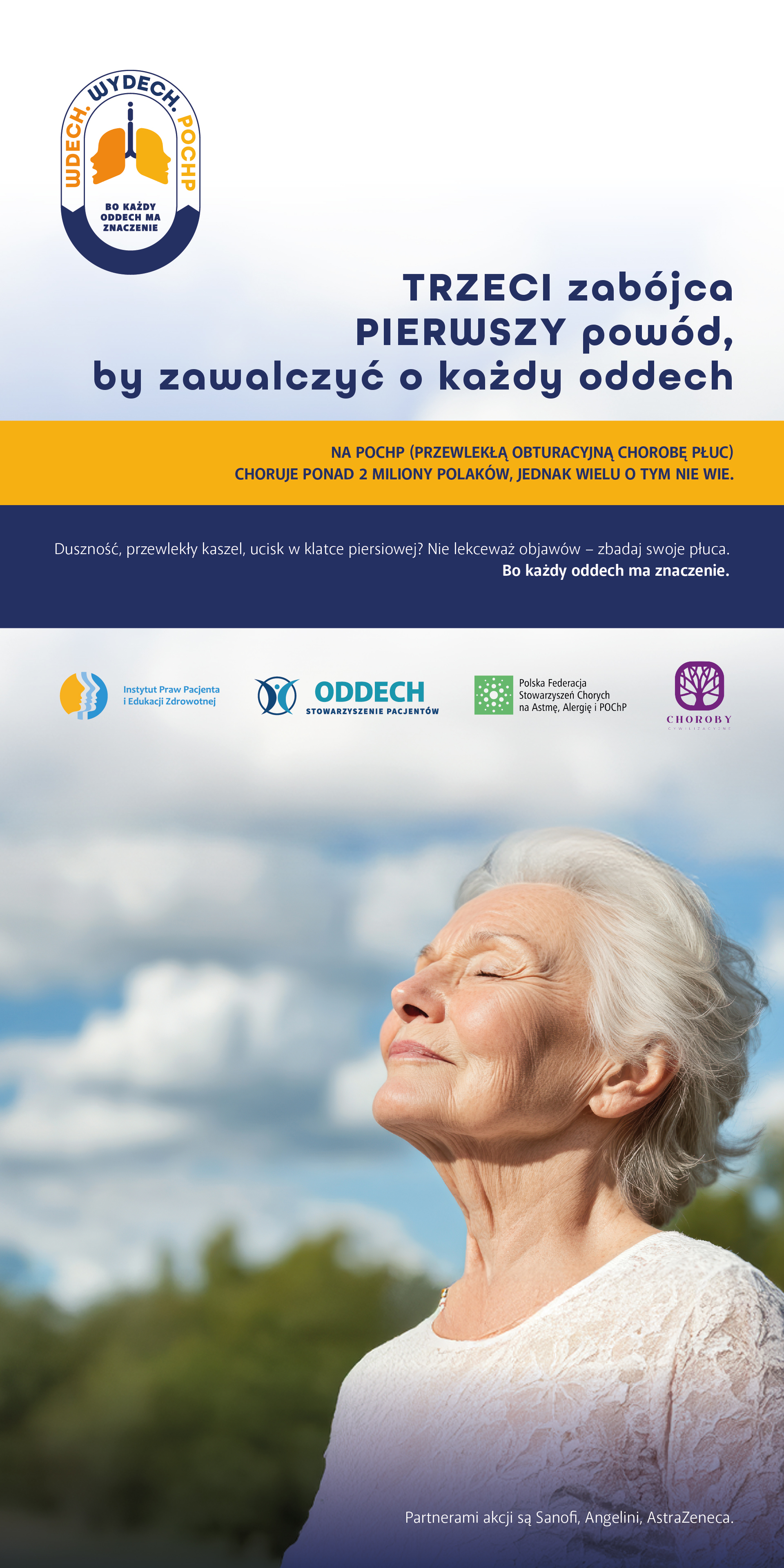 Choć przewlekła obturacyjna choroba płuc – POChP – stanowi 3., po chorobach układu krążenia i nowotworach, przyczynę zgonów na świecie, wiedza o niej pozostaje dramatycznie niska. Zaledwie 3 proc. Polaków wie, co oznacza ten skrót, a 97 proc. nie wie, co się pod nim kryje. Dlatego tak ważne są inicjatywy edukacyjne, jak Światowy Dzień Przewlekłej Obturacyjnej Choroby Płuc (POChP), obchodzony co roku z inicjatywy Global Initiative for Chronic Obstructive Lung Disease (GOLD)[1]. W 2025 roku przypada on 19 listopada i odbywa się pod hasłem „Brakuje Ci tchu? Pomyśl o POChP” (Short of Breath, Think COPD”), które ma zwrócić uwagę na konieczność szybszej diagnozy oraz zwiększenia świadomości objawów tej choroby.